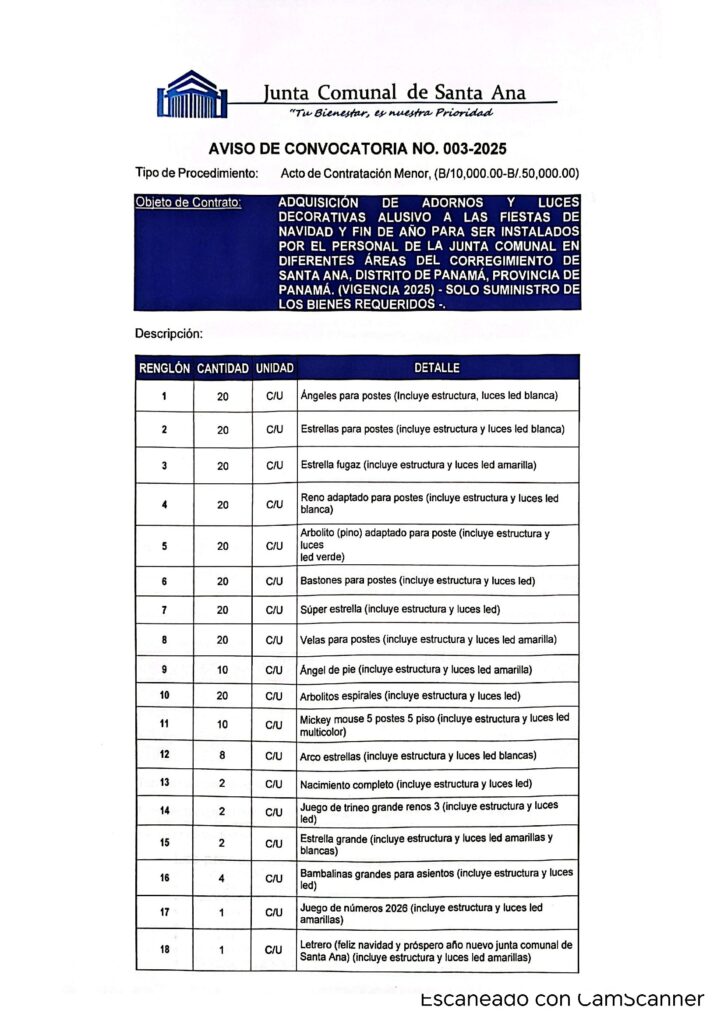 AVISO DE CONVOCATORIA No.001-2025 (B/.10,000.00 - B/.50,000.00) ADQUISICIÓN DE BONOS DE ALMACÉN PARA SER DISTRIBUIDOS A MORADORES DE LOS DIFERENTES SECTORES DEL CORREGIMIENTO DE SANTA ANA, DISTRITO DE PANAMÁ, PROVINCIA DE PANAMÁ. VIGENCIA 2025.
