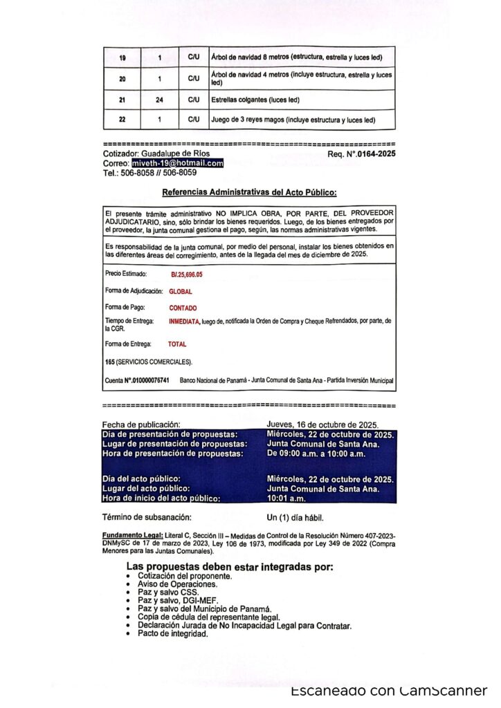 AVISO DE CONVOCATORIA No.001-A/2025 (SEGUNDA CONVOCATORIA) (B/.10,000.00 - B/.50,000.00) ADQUISICIÓN DE BONOS DE ALMACÉN PARA SER DISTRIBUIDOS A MORADORES DE LOS DIFERENTES SECTORES DEL CORREGIMIENTO DE SANTA ANA, DISTRITO DE PANAMÁ, PROVINCIA DE PANAMÁ. VIGENCIA 2025.